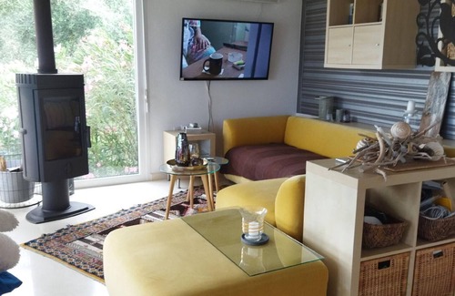 Inside, you will find fully equipped accommodation that leaves nothing to be desired. The villa has two bedrooms and two bathrooms, guaranteeing comfort and privacy for up to two guests. Amenities such as a washing machine for your sole use, an induction hob, a dishwasher and a kettle ensure a carefree stay. A fireplace is available for cosy evenings, while three fans ensure a pleasant coolness on warmer days. Thanks to the partial air conditioning and renewable energy from solar power, the climate in the house always remains pleasant and environmentally friendly.