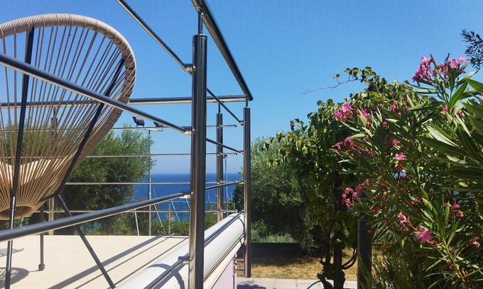 Discover your own private paradise in this charming villa in Paralia Mirtofitou, ideal for couples seeking peace and seclusion in a picturesque setting. Nestled among olive groves, this detached holiday home with its exclusive terrace and breathtaking sea views provides the perfect backdrop for an unforgettable getaway. Thanks to the generous window fronts, the feeling of living indoors is complemented by the natural beauty of the surroundings - a place that puts tranquillity and nature centre stage.