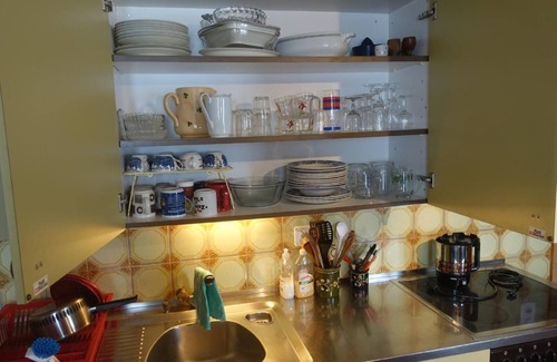 Heating is only possible with a tiled stove in the living room. The electric storage heaters are out of order. In the kitchen, in addition to the electric cooker, there is also a wood cooker, ideal for simmering a really fine tomato sauce for hours.