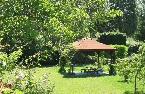 The property is facing green hills and tall tres. It has a large terrace shaded by white roses and grapevine, with two tables and chairs seating 10 people. It has a large enclosed garden/lawn with a 10-meter swimming-pool next to a 4x4 meter gazebo and a barbecue. The lawn is suitable for e.g. badminton, boules and croquet. There are also apple and fig trees and decorative bushes.