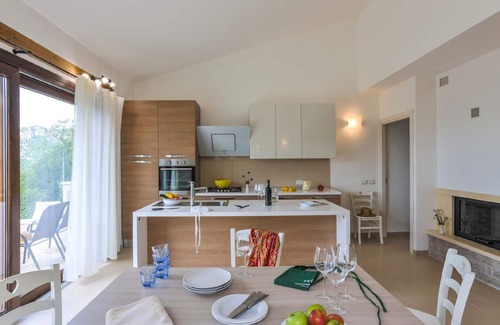 The flat is spread over two floors. On the ground floor there is an open-plan living space consisting of a living room, with a fireplace and sofa, and a modern, well-equipped kitchen. A large French door leads to an outdoor area where you can eat and enjoy the view of the surrounding green hills.