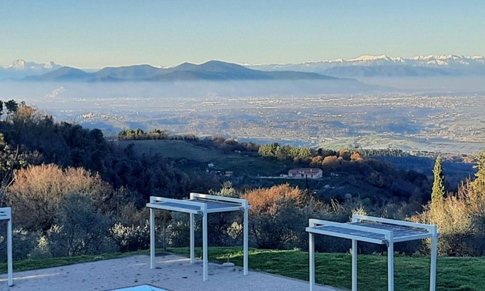 A hidden gem in the Tuscan rolling countryside, raised 350 metres above sea level, Le Polle di Meletro, also known as "Il borgo della pace" with its fantastic panoramic terrace, woodlands and enviable position, resides near the small medieval village of Rivalto. With stunning views down the Valdera valley, the prominent location of the villa has maintained a sense of timelessness, peace and tranquillity. It is an oasis of calmness and harmony in which to indulge yourself and relax, but yet it is only 40 minutes’ drive from Pisa airport.The villa is surrounded by fertile soil that produces a range of superior vegetables, fruits and wine. The nearby fields are host to vineyards, olive groves, fruit trees and cereals, whilst the wooded hills are home to the famous ‘Rivalto’ Chestnut along with a rich selection of flora and fauna. The nodding heads of large sunflowers fill some of the fields in July/August setting the landscape ablaze. The view from our terrace and woodland changes as the seasons change, being green and lush in spring through to a golden yellow in summer before becoming a sea of blazing red as the vines change colour in the autumn months.