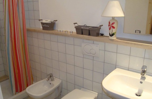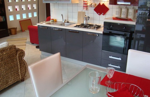 The house with 65m² of living space is suitable for 2-4 guests. The interior tends towards the modern in terms of furnishing and décor, but still adheres to our primary goal of not offering boring standard holiday accommodation. We invite you to experience a special residential flair at Castello Rosso. It has a modern living room with an open modern kitchen, equipped with a gas stove, oven, fridge-freezer, Italian and German coffee machine, toaster, kettle and a dining corner for 6 people. The big L-shaped living room (45m²) has panoramic glazing (glass sliding doors 5.5m wide), satellite TV (international channels), payable Wi-Fi, a comfortable suite with a comfortable and high-quality sofa bed for 2 people, air conditioning and heating. Multi-coloured glass bricks provide interesting plays of light and an unusual atmosphere, both during daylight and in the evening. There is a big bedroom with a double bed, wardrobe, dresser, bedside tables with reading lamps, air conditioning and direct access to the bathroom. Comfortable beds with good mattresses and wooden slatted frames ensure a good night’s sleep. Bed linen is available and is changed weekly. The generous bathroom has a window, shower, WC, bidet, washbasin, hand and shower towels, as well as a hairdryer. Please bring your own beach towels. A washing machine, iron, ironing board and clothes stand are available, as well as a child’s bed or cot on request. All the rooms have air conditioning.