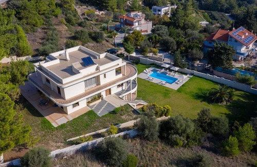 Amaltheia Villa is a 3 story building; guests can use the first and the second floor. Villa has 5 luxurious bedrooms, 3 of them have double beds , 1 of them has a double bed with a double sofa bed and the 5th bedroom has 3 single beds . Also needs to be mentioned that all the beds are single and 11 in total which can be used as double as well . All bedrooms are fully air-conditioned. The master bedroom is offered in classical tones, it has a king size bed, a living room with a double sofa bed and an internal bathroom with Jacuzzi. Also, there are 4 bathrooms as well, 2 of them with a bathtub,1 of them with a shower and a WC. There’s an open plan kitchen, fully equipped for any meal preparation. The wide living room, which is decorated in earthly tones is quite convenient and offers 2 seating areas with sofas,1 cozy seating area with antique rocking chairs and has a TV screen as well as a fireplace. There is free Wi-Fi access throughout the property. On the first floor there’s a furnished veranda that overlooks to the forest and on the second floor there are beautiful balconies leading from the bedrooms. Outdoors, there’s the wonderful private swimming pool with its sunbeds surrounded by the wide garden. There is outdoor furniture where you can enjoy your meals and BBQ installation for al fresco culinary experiences. The garden is pretty large and can host up your special events. A small Greek herb garden is also available. The ground floor of the building is not for use and has a separate entrance from the available floors because in the polite owner will be living there.