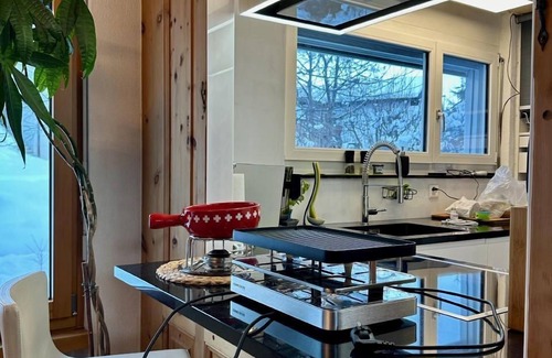 The flats have fast Internet, WLAN, 2 TVs, a massage chair, two spacious open and fully equipped kitchens, two bedrooms with new upholstered beds with new very high-quality pocket spring mattresses, Swiss stone pine furniture and wardrobes, high-quality and modern furniture in an exciting mix with Swiss stone pine elements. Our house has a south-facing balcony with a fantastic mountain view, 2 terraces with mountain views, a private garden with herbs and delicious berries in summer. Garden spa with sauna and whirlpool.