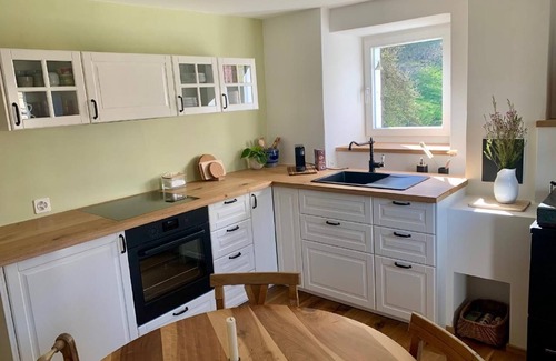 The private garden is undoubtedly one of the highlights of this holiday home. It is available for exclusive use and is equipped with a cosy seating area under fruit trees, which also invites you to relax in the evening. A gas barbecue completes the offer and makes it easy to enjoy meals outdoors while taking in the tranquillity of the surroundings.