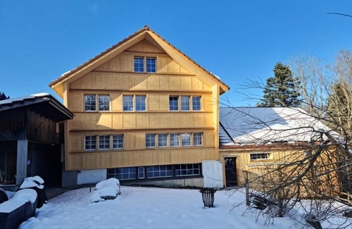 Our country house is an original Appenzell farmhouse newly renovated in 2022. It is located in Speicher in Appenzell Ausserrhoden near St.Gallen in eastern Switzerland. The vacation house offers max. space for 9-11 persons and 1-2 babies. (Ideal occupancy: 5 adults, 3 children +1-2 babies) You stay in the country house with 4 bedrooms, 1. kitchen, 1 washroom / diaper changing room,1 living room and 2 bathrooms (3 double beds, 3 single beds, 1 baby extra bed, 1 baby travel bed, 1 air bed and 1 sofa bed). The house is secluded in the countryside, in the middle of a sheep pasture in the municipality of Speicher. Nevertheless, you are in 10 min in the city of St.Gallen and on the highway. It has parking for about 3 cars and 50m away there is a bus stop. It has a nice outdoor area with slide, deck chairs and hammock for relaxation and with a barbecue area with seating area.