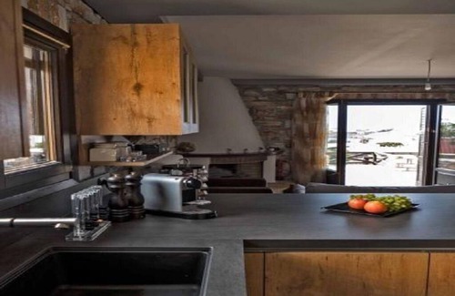 The 265sq.m Villa offers charming design and is entirely crafted from native stone.The property consists of two floors,connected by indoor and outdoor stairs.On the upper floor guests will find a fully equipped,modern ,chef style kitchen with a charming balcony connected to it , a living room with sofa/bed ,TV and stunning sea view and a very comfortable and characteristic dining area. There are two bedrooms on that floor -the Master bedroom,with sea view and en-suite bathroom that even has a jacuzzi in the bathtub ,and a small ,single bedroom with a beautiful window overlooking at the gardens on the back of the house. There is a small WC for guests on that floor. The entire front of the floor is occupied by a big veranda ,offering captivating views of the nature and endless blue of the sea.The ground floor consists of two double bedrooms and one extra double bed that is not in a separate bedroom but it is still in a calm zone and it is a very comfortable place to rest. Many guests prefer to have their young children on that bed. There is also a fully equipped,traditionally decorated kitchen on that floor that features all amenities such as oven,gas stove,coffee maker etc.A cosy living room with two coaches where guests can take a break from the hot summer days and A spacious and comfortable bathroom with WC ,a laundry and drying machine are making this floor a completely independent setting form the upper one. The entire home is air conditioned.