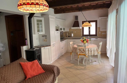 On two levels, large living room with sofa and TV as well as kitchen area with dining table. Bathroom with toilet, bidet and washbasin plus washing machine. On the first floor 2 bedrooms, one double and one twin, bathroom with shower, toilet, bidet and washbasin. Modern in taste but with the charm of Tuscan houses. The house has heating. From the living room, through a large, bright window, there is access to the veranda facing the pool.