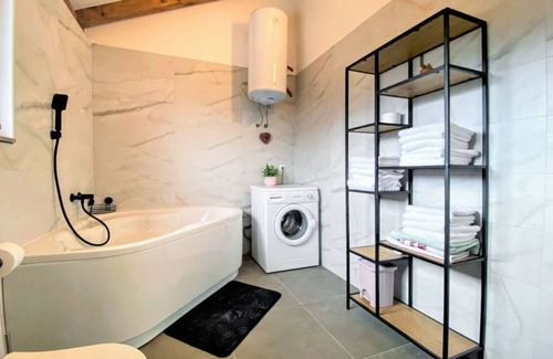 BATHROOM (1): Size of the bathroom is: 9 m2. Equipment in the bathroom: bath tub, toilet, washing machine, tiles, hairdryer, bath towels.
