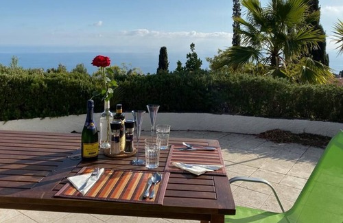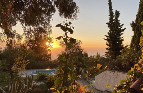 For rent is a beautiful holiday home with its own pool, large garden and private parking (up to 4 cars), in a magical location and a unique view of the sea. The garden offers a small biotope (pond) with numerous goldfish, large playground for football, badminton and the like. v.m numerous trees, palm trees and beautiful plants. The pool is 11m long, almost 5m wide and is 1.7m deep at the deepest point. The pool area is well shielded for optimal privacy.