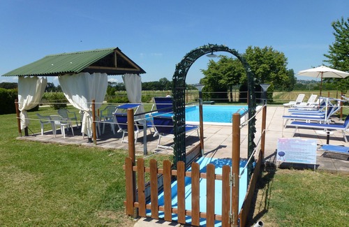 It 'set in a large private garden with swimming pool, fruit trees available to the customer, flowering plants.