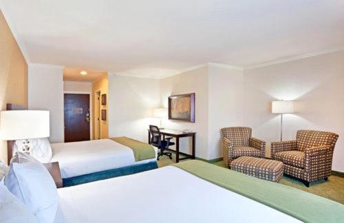 This hotel is a 5-minute drive from the Washington State Fairgrounds and the city center of Puyallup, Washington. It serves a daily buffet breakfast and features rooms with a 37-inch flat-screen TV. Each spacious room at the Holiday Inn Express Puyallup is furnished with a microwave, refrigerator and coffee maker. Decorated with white linens and carpeted floors, all rooms include free Wi-Fi and a DVD player with access to a free DVD lending library. Free access to the on-site gym and hot tub is provided to all guests of the Puyallup Holiday Inn Express. A business center and free on-site parking are provided. Wild Waves Water Park is just 9 miles from the hotel. Joint Base Lewis McChord is 13 miles away.