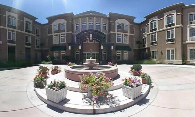 An outdoor pool and a hot tub are on site. Other recreational amenities include a sauna and a fitness center.