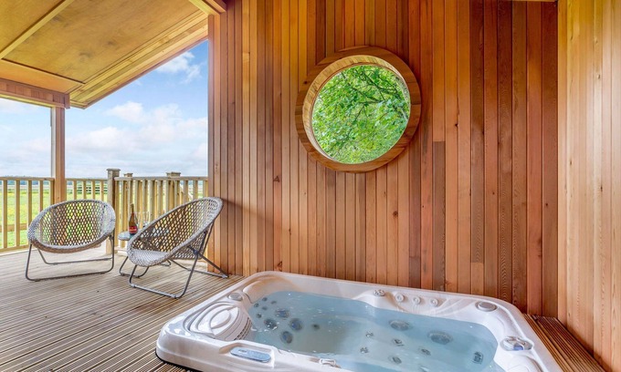 Brand new for 2022. Perfect or couples. Modern, spacious and contemporary lodge furnished to a high standard set in a premium position boasting countryside views. Spacious Kingsize bedroom with TV and en-suite shower and bath. Open plan kitchen/living space. Outdoor covered hot tub with either porthole or double fronted aspect depending on location. No pets.