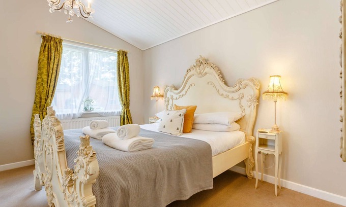 Shabby chic and spacious luxury retreat. Sumptuous king size antique style bed and widescreen TV/DVD. Separate modern fully equipped kitchen. Extravagant panelled bathroom with freestanding bath, sauna and separate shower and French doors leading to sunken canopy covered outdoor hot tub with magical twinkling star lights. No pets.