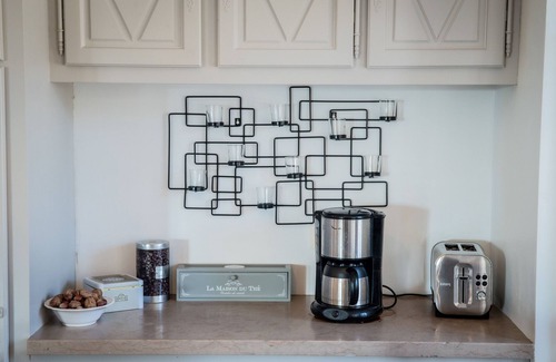 A vast authentic kitchen created for the Provençal cook Marius Bernard, opening onto the living room, equipped (5-burner gas hob, American fridge, oven, microwave, kitchen utensils, dishwasher, a kettle, a filter coffee maker, a Nespresso coffee maker and a toaster). Access to the garden and swimming pool is through a French window from the kitchen.