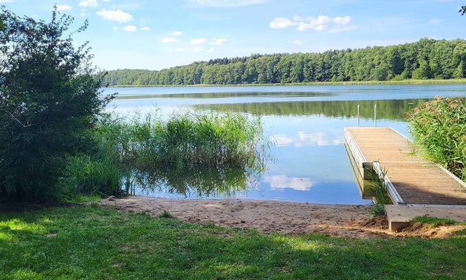 The apartment is on the first floor, 300m walk from Godendorfer See (air line approx. 100m) with a swimming area and rowing boat in a residential street.