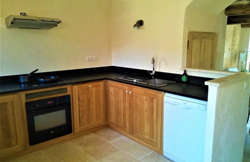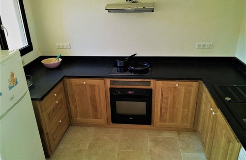 A bathroom with large walk-in shower. Fully equipped kitchen (dishwasher, oven, hob, fridge) open to the living room with convertible sofa bed.