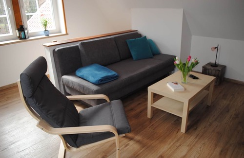 After 3 years of extensive renovation work, we were able to put our apartment into operation in March 2017. A modern, fully equipped apartment awaits you in the attic of an old barn on about 60 square meters, which leaves nothing to be desired. In addition to a modern bathroom, you will find a spacious kitchen / dining area, a cozy living room / bedroom with an electric fireplace, a friendly bedroom and a comfortable sleeping area on a loft.