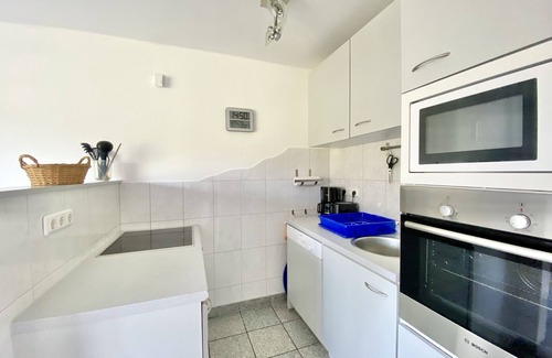 - Kitchen approx. 9.0 m², fitted kitchen with dishwasher, electric stove with oven, refrigerator, microwave, access to the covered terrace.
