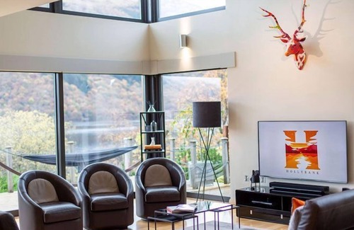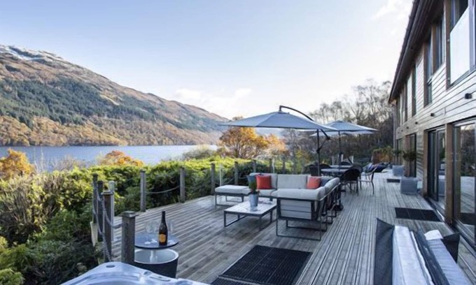Stunning large contemporary house with hot tub on the shores of Loch Lomond with fantastic views of the water from all rooms. Situated in the national park six miles north of Luss and looking across the loch to Ben Lomond and the mountains beyond it offers an ideal location within the park as a base for a holiday in one of Scotland's most beautiful and scenic areas.