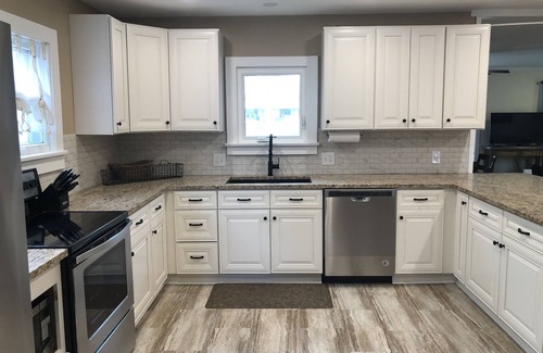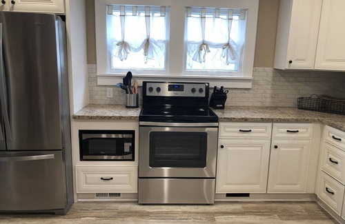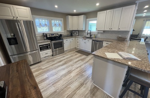 The newly upgraded kitchen does not spare any small details. From the granite counters to new appliances, you will feel at home! Quality matching dishes, cups, and utensils are provided as well as pots, pans and bakeware. Other items provided include a crock pot, hand mixer, blender, and wine and cocktail glasses. Basic spices and cooking supplies are provided. The kitchen bar top seats four and also doubles as a baking center, buffet, or work space.