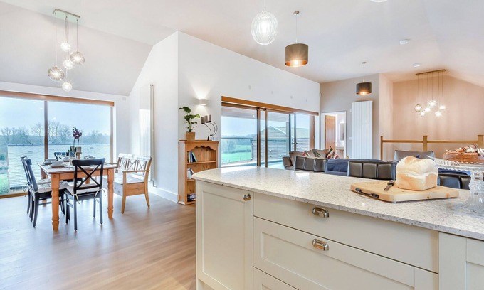 The ground floor features three beautifully appointed bedrooms, each with its own en-suite shower room, ensuring every guest enjoys privacy and convenience. A utility room on the ground floor adds to the practicality of this thoughtfully designed home. Upstairs, the large open-plan kitchen, living, and dining area is the heart of Hollyhocks, where you can cook, dine, and relax in style. The space is flooded with natural light, thanks to the large windows that offer panoramic views of the surrounding fields and farmland. Step out onto the expansive balcony, perfect for alfresco dining or simply enjoying the tranquil rural scenery. Whether you’re sipping your morning coffee or sharing a meal under the stars, the balcony provides the perfect vantage point to take in the beauty of Northamptonshire. Hollyhocks is the perfect countryside getaway for those looking to unwind in a stunning setting. Hollyhocks sits on 500 acres of private land, where guests can explore at their leisure.