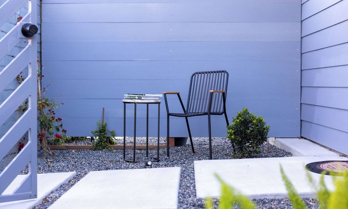The kitchen and dining area are generously sized, though please note there is no stove or range. Outside, relax at a charming European-style coffee table in the beautifully landscaped front yard. This guesthouse combines modern amenities with timeless charm, making it the perfect retreat.