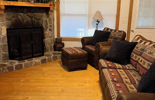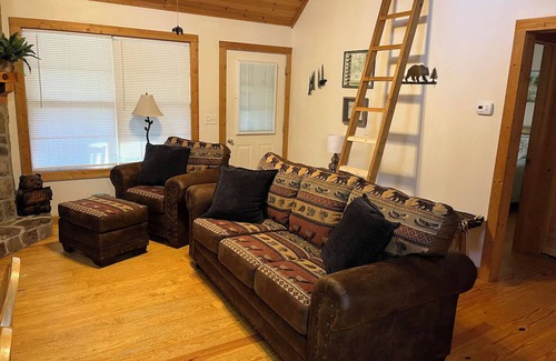 The cabin is all on one level (besides the loft) and has central heat and air, a stone fireplace, large deck, grill, fire pit to enjoy outdoors, washer/dryer, smart TV and WI-FI.