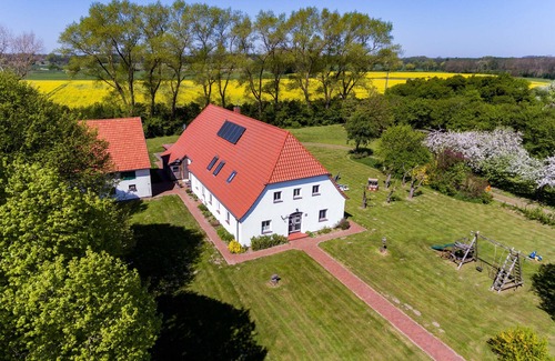 The original farmhouse from 1938, stands on a large, fenced plot (5 600 m²). The former living area for the reapers (= harvest helpers) was extensively renovated and converted into a modern apartment and offers a fantastic view of nature. The apartment is accessed through a separate entrance and has its own spacious garden area, which allows an undisturbed and restful stay. • 4-star classification by the German Tourism Association • 90 m² • Separate entrance • Large garden with playground equipment, orchard with fruit and berries for your own use, parking in the carport • fully equipped kitchen, incl. Dishwasher and microwave, 2 large freezer drawers in the fridge • Free Wi-Fi in the entire living and outdoor area • TV / DVD / HIFI • Sauna / Danarium (herbal steam bath) for exclusive, free use • washing machine • safe