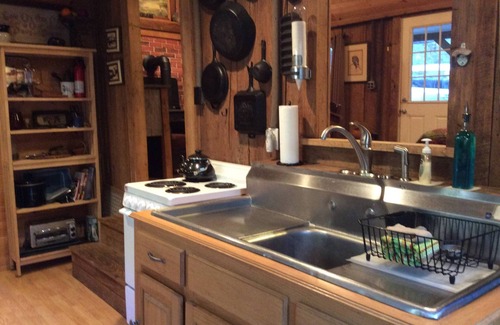 Sitting above Sams Creek in the Appalachian mountains, we offer a rustic, wormy chestnut over 100 year old, updated cabin ( 548 sq. ft. ) with a screen front porch & covered and open side deck with outdoor wood burning fireplace ( we provide a reasonable amount of firewood and have more for purchase ), propane grill, living/queen bedroom, kitchen & full bathroom with standing shower. Steps away is a bunkhouse with queen bed, bunk beds with stairs, 2 chairs and full bathroom with standing shower. The cabin and bunkhouse have heat & air and will sleep 1-6 total. We have cards, Uno, checkers, Monopoly, poker chips, the Ring game, cornhole, and have a badminton court ! Bring your fishin’ pole - we have native brown and rainbow trout right here in Sams Creek - no license required on our private property. It’s like having your own personal park. We have FIBER INTERNET for your work or school needs. We have a DVR with a 31” tv screen and a nice selection of family movies. We have a Fire stick. Our tap water is from a well that is almost 700’ deep in the aquaphor - pure, clean and delicious !