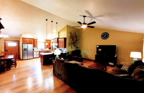 Large open area to gather the entire family. The first floor offers a beautiful kitchen with a large table, breakfast bar and living room with a sectional couch. A spacious master bedroom with a king size bed, 5 piece bath, laundry room and another half bath. Downstairs offers a large family room with another King size bed, large TV, two couches with books and board games. Two additional guest rooms, both with kings sized beds and another full size restroom.