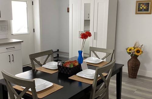 The fully equipped kitchen features top-of-the-line appliances, dishes, cookware, baking equipment, a toaster, and all necessary utensils. We also provide oil, vinegar, spices, sugar, creamers, teas, cocoa, and organic coffee. In the bathroom, you'll find towels, a hair dryer, as well as basic toiletries such as shampoo, conditioner, and shower gels. We offer hot water on demand and provide an in-suite washer/dryer with detergent and softener included. The bedroom boasts a comfortable queen-sized mattress, while the living room offers a sofa bed with a plush mattress topper. The suite has its own private entry, accessed via a set of 15 stairs. Please note that this home is not suitable for parties or events, and only registered occupants are allowed overnight stays. There is ample parking space available.