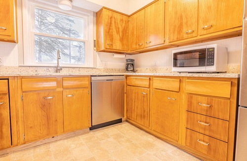The kitchen has been recently renovated, so you'll find all your cooking tools and necessities there. There is a large eat-in area with a table for six (8 can be accommodated with additional leaf), and a side counter with a breakfast bar and stools. Kitchen has dishwasher, microwave, complete dishes and utensils.