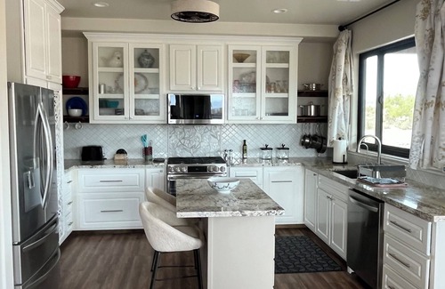 The primary bedroom is lovely with a comfortable king size bed, a 55” television and beautiful custom door to the covered patio. The primary bathroom is spacious! Huge soaking tub, and walk in shower that will accommodate a wheelchair. The primary walk in closet is just off the bathroom. The stargazing from the home is calming and beautiful.