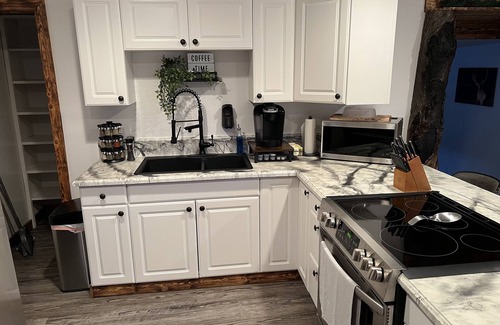This home is 1 bedroom, 1 bath, with a queen sized sofa bed. The master bedroom contains a king size bed. The kitchen comes with a fully stocked coffee bar and all the cooking equipment needed to enjoy a wonderful homecooked meal. The living room is amended with a 65" smart TV. This house also comes with a laundry unit, BBQ, & a outdoor lounging area to enjoy the beautiful view of the surrounding mountains. The house is equipped with shampoo, conditioner, body wash, laundry detergent, and dryer sheets. The trash cans and hand soap dispensers are touch free and motion activated.