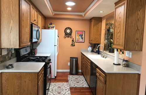 Our home is in a quiet, safe, friendly neighborhood right next to the huge El Dorado Park with walking paths, playgrounds and a dog park. We are a 10 minute drive to Seal Beach and about 20 minutes to Disneyland. There are 3 bedrooms, 2 newly renovated bathrooms, a living room, kitchen and dining area. The master bedroom is equipped with a desk. In the back yard we have a covered outdoor patio, BBQ and a backyard lounge area. It is enclosed and private. We also have a pack & play, high chair and strollers for your convenience. Please call Selina if you have any questions at 562-431-6824.