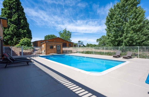 Sequoia Homestead: family fun in Kanab located centrally to Zion, Bryce Canyon, and the Grand Canyon! Our 2-bedroom Kanab home offers a heated pool, playground, and plenty of room for the whole family (up to six and your pet is welcome, too!). Savor magical evenings on the patio. Grill up a feast on the BBQ and enjoy meals at the picnic table, then gather around the fire pit and watch the stars come out. Relax poolside and watch the breathtaking sunset over the cliffs.