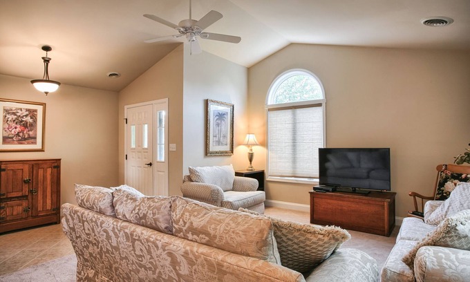 This one level, furnished home features a great room with cathedral ceiling, dining room next to the living room with a pass through to the eat-in-kitchen with granite counters and tile backsplash, pantry, sun room and large patio.