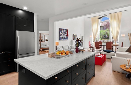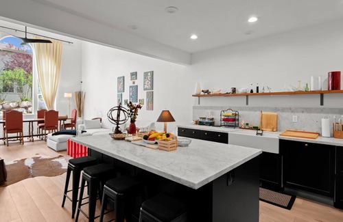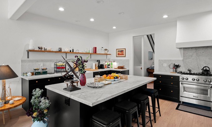 The fully equipped kitchen is a cook's dream, featuring stainless steel appliances and a spacious layout. It includes a kitchen island with four barstools, perfect for casual dining or entertaining guests. For coffee enthusiasts, a Nespresso machine is provided, along with an air fryer, pressure pan, skillet, and a bullet blender, ensuring all your culinary needs are met.