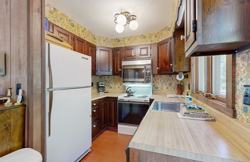 When you're ready to relax, kick back, and unwind, find yourself lounging on the wrap-around deck, or head inside where a spacious living room awaits your family visits. Adorned with plush seating, a large TV, the ambiance this room gives off is warm and welcoming. The well-equipped kitchen is a good space to practice your culinary skills, and you can dine together as a family at the adjacent dining table.