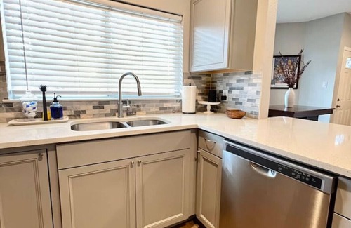Discover comfort in this 2-bedroom sanctuary boasting a sleek kitchen, chic dining area, and updated bathroom. Enjoy privacy with blackout curtains, unwind in the fenced backyard with a covered patio, and indulge in modern entertainment with Smart TVs featuring Netflix, Amazon Prime, and Disney+. Perfectly situated in a prime location, this retreat promises an ideal blend of convenience and relaxation.