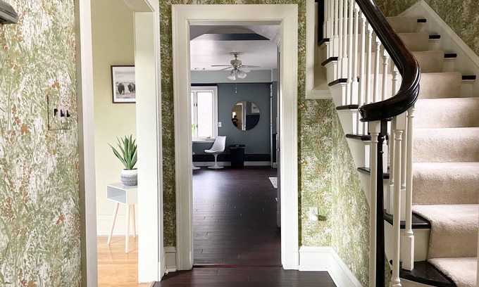 This is a fully renovated entire private home with hi-speed internet, multi-level backyard with fire pit, and bench swing with a view of the woods, 4 very quiet bedrooms and 5th loft bonus room, garage, large full kitchen w/all cookware included, dishwasher, washer & dryer. All bedding is high quality, high thread count. All beds are elevated from the floor with new firm memory foam mattresses. All brand new furniture, kitchenware, dinnerware, linens, etc. included. Perfect for families!