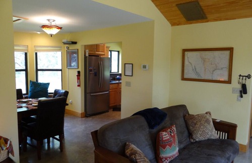 Ranch Home with 1 bedroom, 1.5 bathrooms, cozy living room and two-person work area, private porch with hot tub, Propane grill and four rocking chairs.