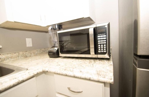 Prepare a home-cooked meal in the kitchen, complete with an oven, a stovetop, and a refrigerator, as well as an electric kettle, a microwave, and a toaster. In addition, there's a deep soaking tub, along with towels and a hair dryer. And there's a washer/dryer, so you can even pack a bit lighter.