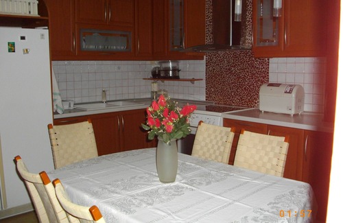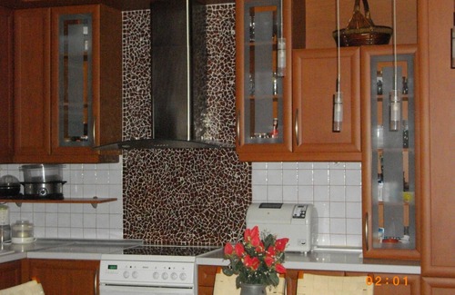 Fully equipped kitchen with many cupboards and all necessary items of dining such as dishes, glasses,silverware, cutlery, pots, pans, kettles, electric egg kettle , pressure cooker, electric lemon squeezer , coffee maker etc.