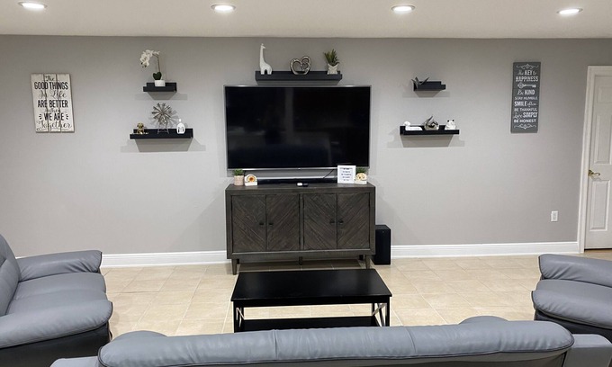 This 3,000 square foot, single story home is perfect for groups who want to stay together in a relaxing & comfortable home yet still have their own space & privacy. It can easily accommodate 16 people with its 5 bedrooms & 4.5 bathrooms. Comes with equipped kitchen, toiletries, washer & dryer, wifi, directv, smart tvs/rokus, billiards table entertainment room, board games, free parking, & a backyard area with patio furniture & BBQ grill.