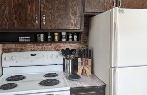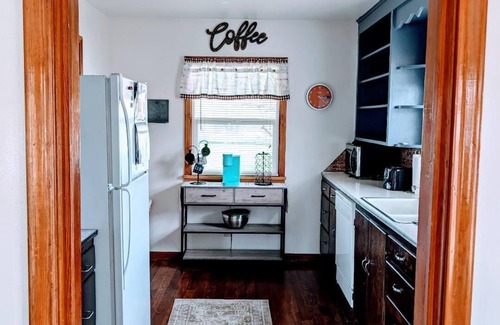 Our sweet, charming home has two bedrooms, queen size beds in both, there is also a futon couch in one of the bedrooms, TV's in both rooms and a 65" tv in the living room. Nightstands with charging stations and lamp. Nice comfy couch with chase in living room and cozy glider rock chair with foot stool. The kitchen table is also arranged cozily in the living room. Also, some boardgames/card games are available.