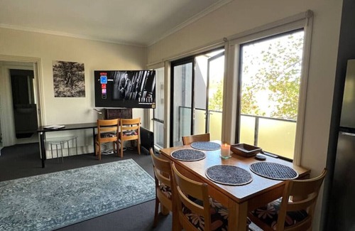 Private, cozy 1-bedroom apartment in St Kilda. Features dedicated workspace, comfy couch, 65cm smart TV, dining table, dishwasher, washer/dryer, gas stove, oven, microwave.